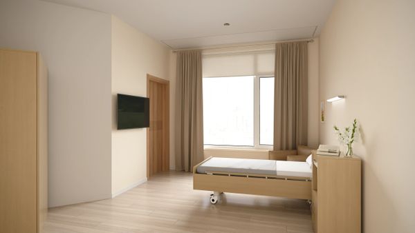 ● A hospital bed, pillows and bed linen